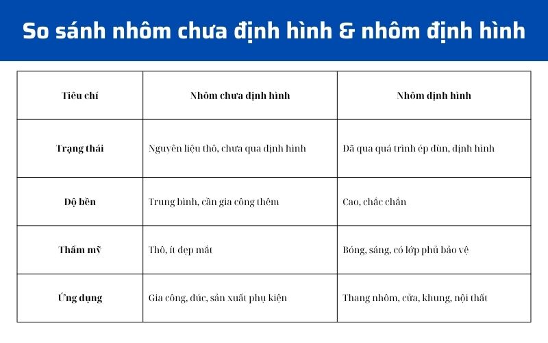 Bảng so sánh giữa nhôm định hình và chưa định hình